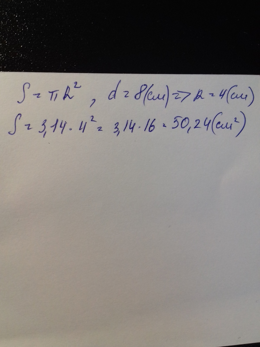 Найти площадь круга, если его диаметр=8см и п(пи)=3,14