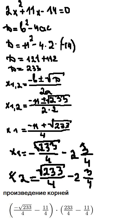 1. Чему равно произведение корней уравнения 2x^2+11x-14=0?
