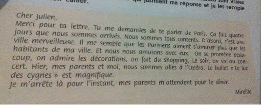 Спасибо за твое письмо. Ты меня просишь рассказать тебе про Париж. Прошло четыре дня как мы прибыли. Мы все очень довольны. Для начала, это великолепный город. Мне кажется, что парижане любят развлекаться больше, чем граждане моего города. И мы забавляемся вместе с ними. Мы много гуляем, любуемся декорациями, делаем шоппинг. Вечером, мы идем на концерт. Вчера, мои родители и я, поехали в Оперу. Балет «Лебединое озеро» великолепен!