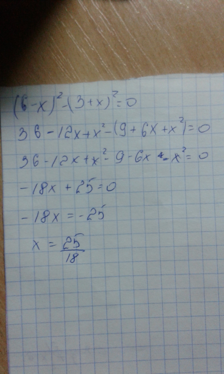 Розв*яжіть рівняння (6-х)² - (3+х)²=0
