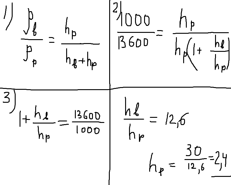 В разные колена сообщающихся сосудов налита вода и ртуть. Уровень воды на 30см выше уровня ртути. Чему равна высота ртути?