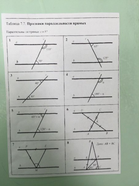 1)а||b,т к на рисунке отмечены односторонние углы ,и их сумма=180°,т.е 110+70=180°(а если сумма односторонних углов=180°,то прямые||); 2)не параллельны, т.к 65+125=190°; 3)а||b, т.к 40°=40°-это накрест лежащие,а если накрест лежащие =,то прямые ||; 4)а||b,т.к эти углы односторонние и в сумме =180°,т.е a+180-a=180°; 5)не параллельны,т.к эти углы накрест лежащие и они не равны 60-а не =120-а(разные градусные меры); 6)рассмотрим ∆DKC и ∆ АКВ;1)ВК=KD( по условию);2) СК=КА(по усл); 3)уг.DKC=уг АКВ(вертикальные)=> эти ∆ =;=>уг.С=уг.А; уг.D=уг.В=>а||b; 7)∆РЕМ-равноб,т.к РМ=РЕ=>уг.М=уг.Е,а они односторонние, значит уг М+уг. Е=180°. 8)АВ=ВС=>уг А=уг С=>∆ АВС-равнобед;=>уг.КАР=80°-40°=20°,рассмотрим∆ АКР-равноб,т.к АК=КР=>уг КАР=уг КРА=>эти углы односторонние при прямых a и b АР-секущей,их сумма составляет 20+20=40°,а односторонние в сумме =180°=>эти прямые не параллельны