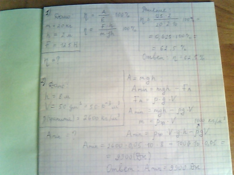 Какую потенциальную энергию имеет металлическая деталь объемом 4 дм/3(к кубу) на высоте 2 м?1.При помощи подвижного блока поднимают груз массой 20кг на высоту 2 м. прикладывая силу 125 Н.Определить коэффициент полезного действия блока. 2. Какую минимальную работу нужно исполнить, что бы с дна озера глубиной 8 м. поднять на сушу кусок гранита объемом 50 дм3