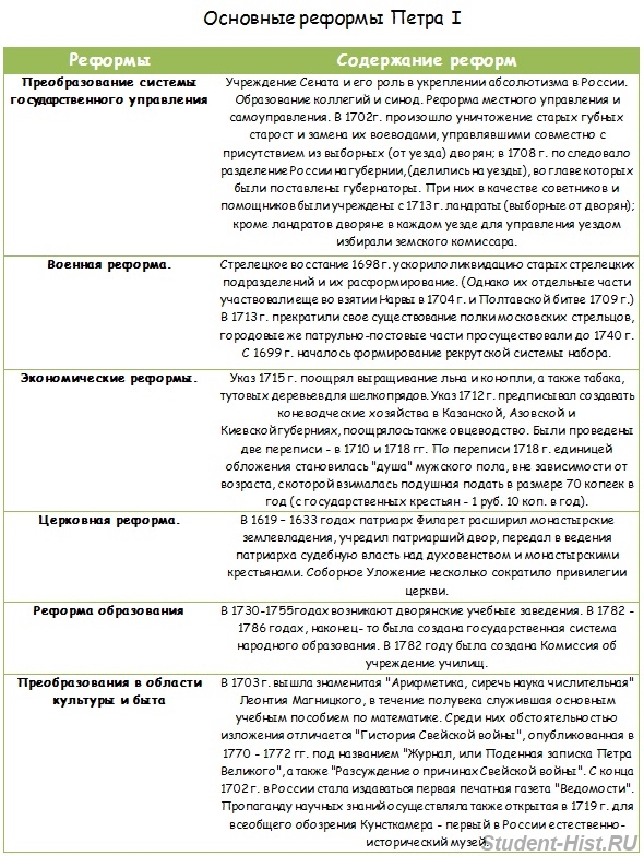 реформы петра 1 : преобразование систем гос-ого управления,военная реформа, церковная,экономические реформы,реформа образования,преобразования в области культуры и быта