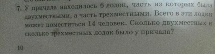 нарисуй на листике 6 лодок, разлели каждую на 2 части, т.е. получилось 6 двухместных лодок, 6×2=12 мест, т.к. нужно 14 мест, то не хватает 2 мест, т.е добавляем2 лодкам по 1 месту. а так решения нету