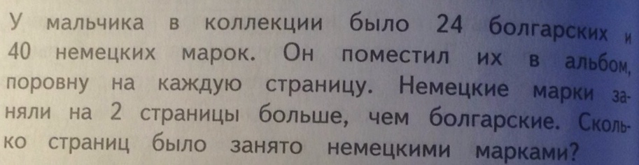 мальчика в коллекции 40 немецких марок Он поровну на каждую страницу уняли на 2 страницы ко страниц было занято