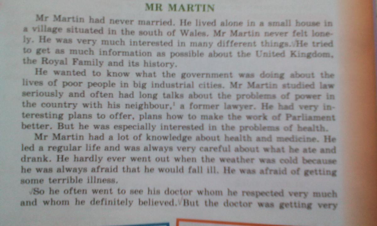 Мистер МАРТИН Мистер Мартин никогда не был женат. Он жил один в маленьком доме в деревне, расположенной на окраине Уэльса. Мистер Мартин никогда не чувствовал себя одиноким. Он очень интересовался множеством разных вещей. Он пытался Бо получить как можно больше информации об Соединенном Кингдоне, королевской семье и ее истории. Он хотел знать, что правительство делает с жизнями бедняков в крупных промышленных городах. Г-н Мартин серьезно изучал ИО и часто долго беседовал о проблемах власти в стране со своим соседом, бывшим юристом. У него были очень интересные планы, планы, как улучшить работу парламента. Но особенно его интересовала проблема здоровья. Мистер Мартин хорошо разбирался в вопросах здоровья и медицины. Он вел обычный образ жизни и всегда очень внимательно относился к тому, что ел и пил. Он почти никогда не выходил на улицу в холодную погоду, потому что всегда боялся, что заболеет. Боялся заразиться страшной болезнью. Поэтому он часто ходил к хин доэтору, которого очень уважал и которому определенно верил.