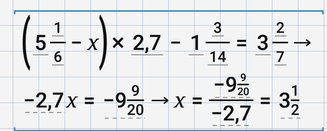 (5 1/6 -- x) x 2.7 - 1 3/14 = 3 2/7