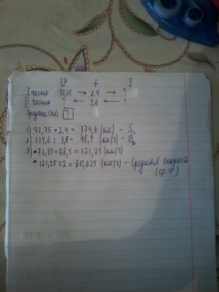 1)Из одного города в другой выехал поезд. Первую половину расстояния он проехал за 2,4 часа со скоростью 72,75 км/ч, а вторую половину - за 3,6 ч. Найдите среднюю скорость поезда.