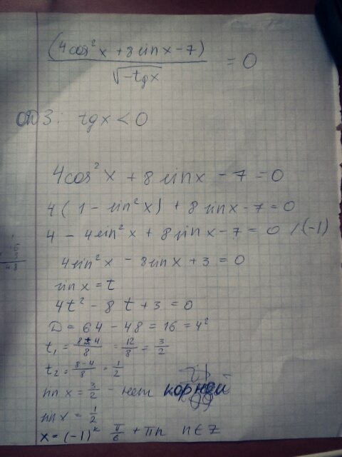 Добрый день, помогите пожалйста решить спасибо. (4cos^2x+8sinx-7)/(корень от -tgx)=0.
