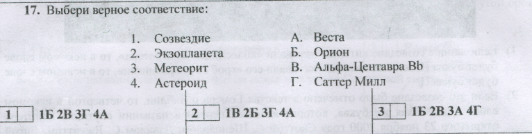 17) 1) Созвездие Орион (Б); 2) Экзопланета Альфа Центавра B b (В); 3) Метеорит Саттер Милл (Г); 4) Астероид Веста (А).