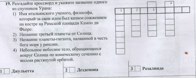 19) Спутник Урана - Дездемона. 1) Джордано Бруно; 2) Земля; 3) Нептун; 4) Комета.