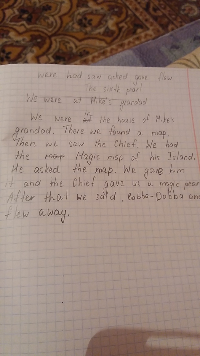 we were in the house of Mike's grandad. There we found a map. Then we saw the Chief. We had the Magic map of his island. He asked the map. We gave him the map and the Chief gave us a magic pearl. After that we said "Babba - Dabba" and flew away