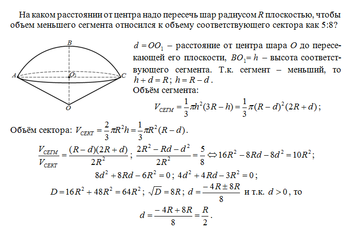 На каком расстоянии от центра надо пересечь шар радиусом R плоскостью, чтобы объем меньшего сегмента относился к объему соответствующего сектора как 5:8?