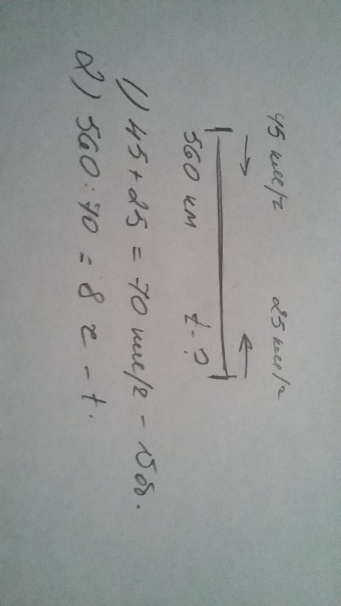 за час они проплывают 45+25=70км 560/70=8часов