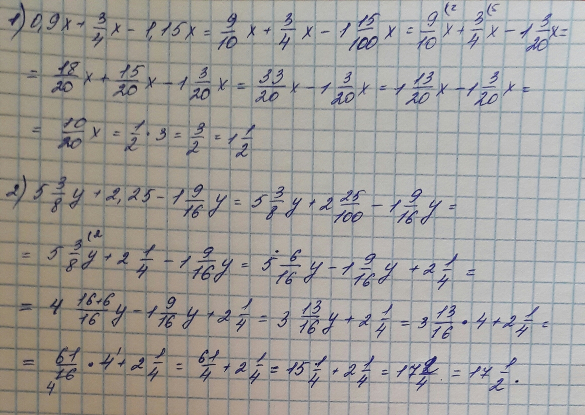 1)0,9+3/4х-1,15х=0,9х+0,75х-1,15х=1,65х-1,15х=0,5х=0,5×3=1,5