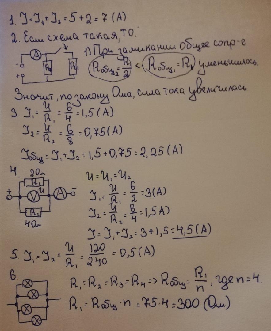 1. В каждом из двух параллельно соединенных проводников сила тока соответственно равна 5 и 2 А. Чему равна общая сила тока?