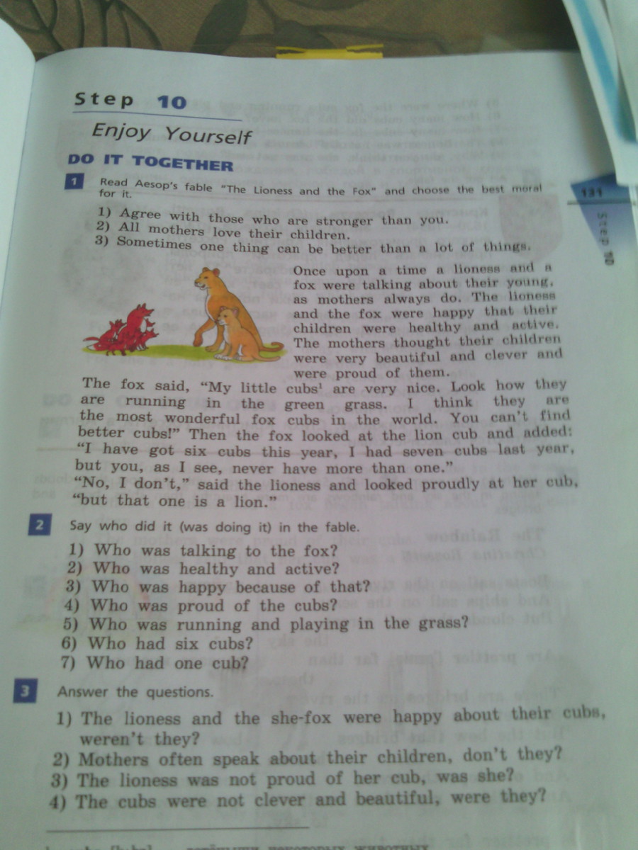 Давным-давно львица и лиса обсуждали молодых, как матери всегда делают всё для них. Львица и лиса были счастливы , потому что их дети были здоровыми и активными. Матери считали своих детей очень красивыми и гордились ими. Лиса сказала:" Мои маленькие детёныши очень хорошие. Смотри как они бегают по зелёной траве. Я считаю их самыми прекрасными детёнышами в мире. Ты не сможешь найти лучше них!" Затем лиса посмотрела на детёнышей льва и добавила: Но у вас лишь один лев. " Нет я не говорю что вы очень гордые за детёнышей ведь у вас лишь один лев."