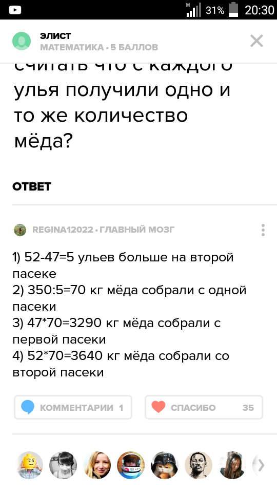 2)350:5=70 кг меда собрали с 1 пасеки.