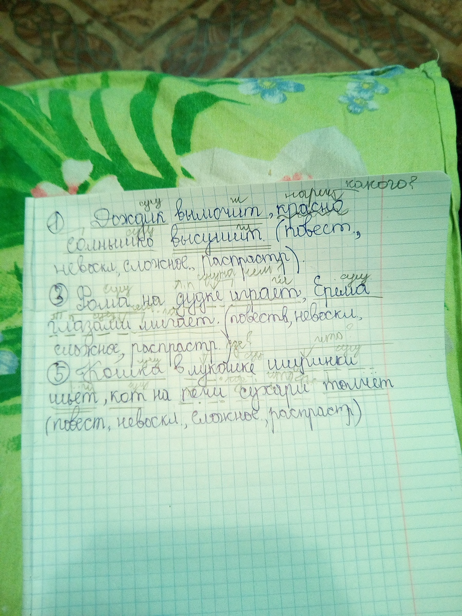 Дождик вымочит ,Красно солнышко высушит. 3.Фома на дудке играет, Ерёма глазами мигает. 5.Кошка в лукошке ширинки шьёт, кот на печи сухари толчёт. Тут нужно подчеркнуть всё, это раз. Например, Повеств. Не воскл . сложное ( . основы) Распространённое(т.к. есть например втор челны)