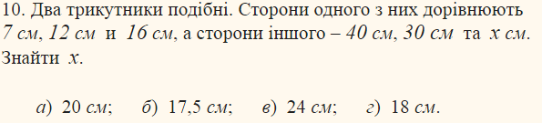 Стороны не сходственные; треугольники, по условию подобны, следовательно, стороны одного должны быть пропорциональны сходственным сторонам другого. Это возможно только при отношении сторон 16/40=12/30=7/x