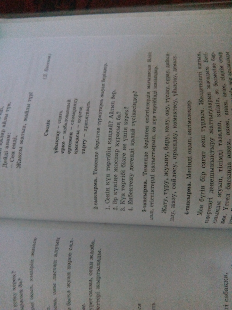 Мен азанда сагат 7-де тұрамын, содан соң бетімді, тісімді, қолымды жуамын . Содан соң таңғы тамағымды жеп, киімімді киіп үйден шығамын мектепке қарай