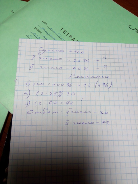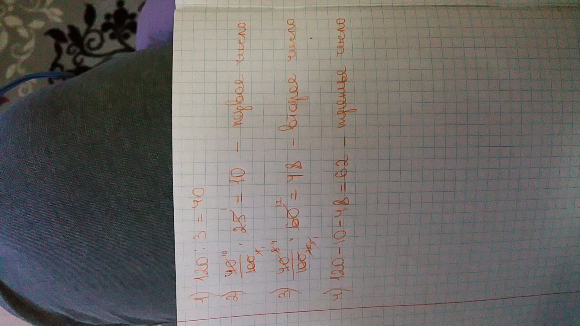 Сумма трёх чисел равно 120.Первое число составляет 25% от всех суммы,а второе 60%.Найдите эти числа