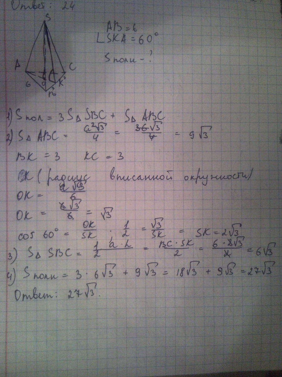 В правильной треугольной пирамиде сторона основания 6, боковая грань составляет с плоскостью основания угол 60 градусов. Площадь полной поверхности равна?