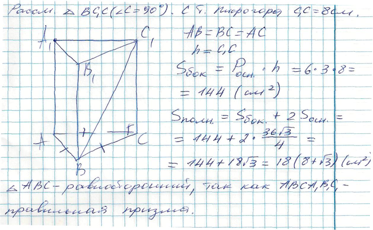 Так как дана правильная призма, то в основании лежит равносторонний треугольник, а боковые грани - прямоугольники. Боковой кант равен высоте призмы. Рассматривая боковую грань, с теоремы Пифагора находишь боковой кант. Далее применяешь формулы. S(боковое)=P(переметр основания)*h. S(полное)=S(боковое)+2S(основания). И так как в основе равносторонний треугольник, то его S=(сторона умножить на корень из 3)/4. Вот краткое решение.