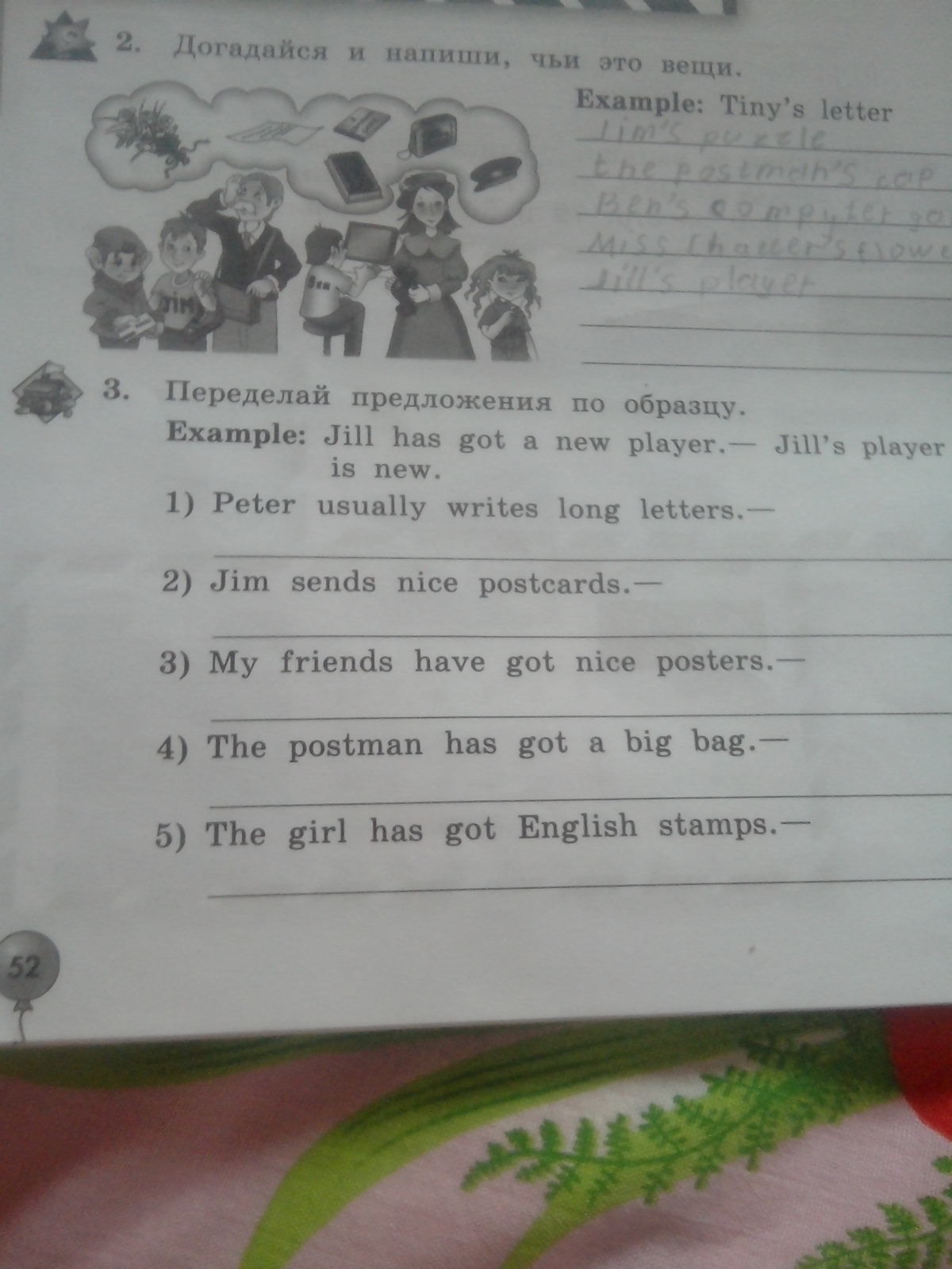 Питер пишет длинные письма.Джим отсылает красивые открытки. У моих друзей красивые плакаты.У почтольена есть большая сумка.У девочки есть английские марки.