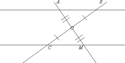 Пусть в центре - точка О, тогда угол СОМ равен углу АОВ(вертикальные). Затем СО=ОВ и МО=ОА + 2 равных угла следовательно по признаку равенства через 2 стороны и угол между ними 2 треугольника равны (АОВ=СОМ) следовательно АВ=СМ