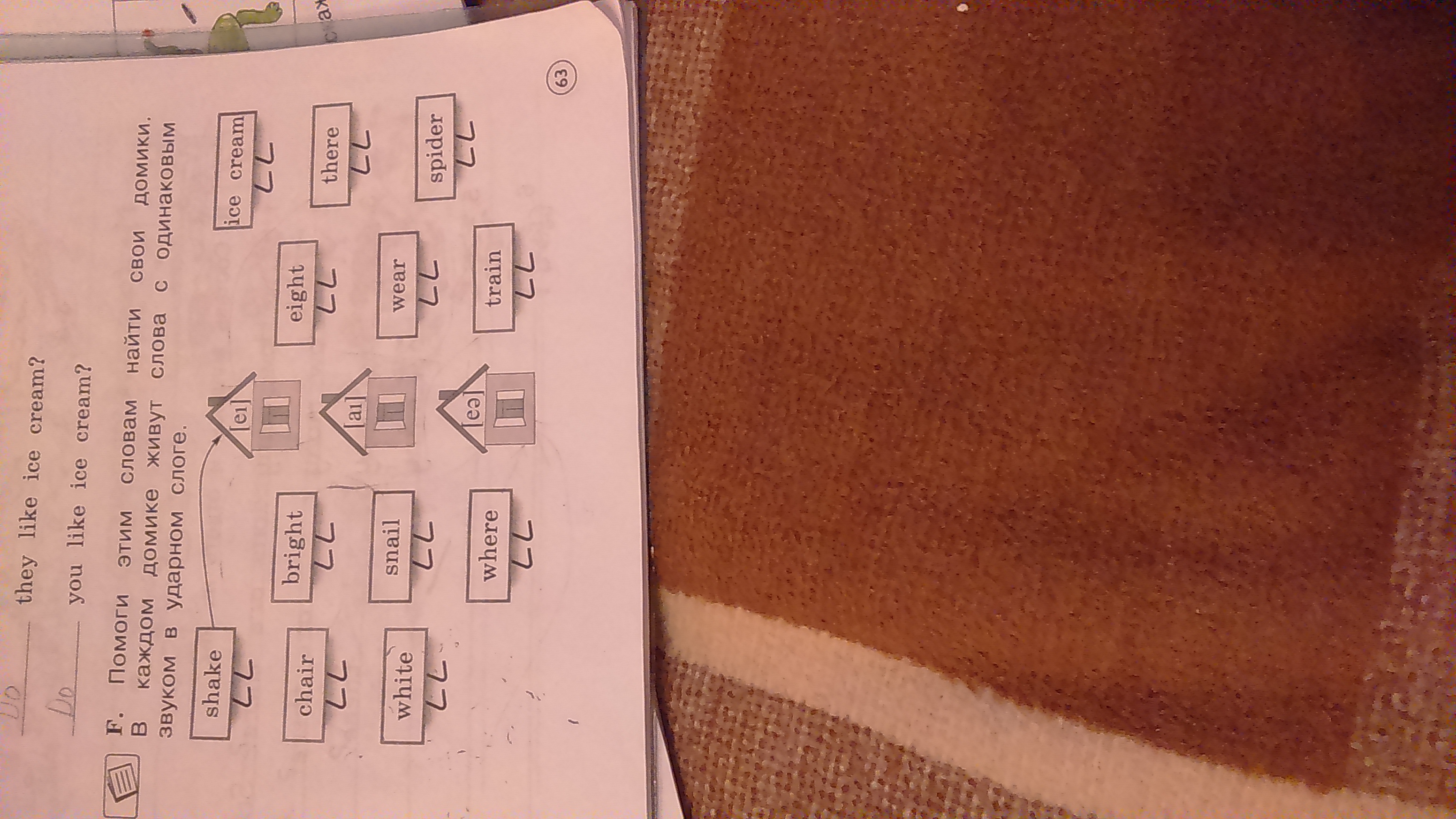 Chair 3, bright 2, snail 1, write 2, where 3, eight 1, wear 3, train 1, spider 2, ice cream 2, there 3