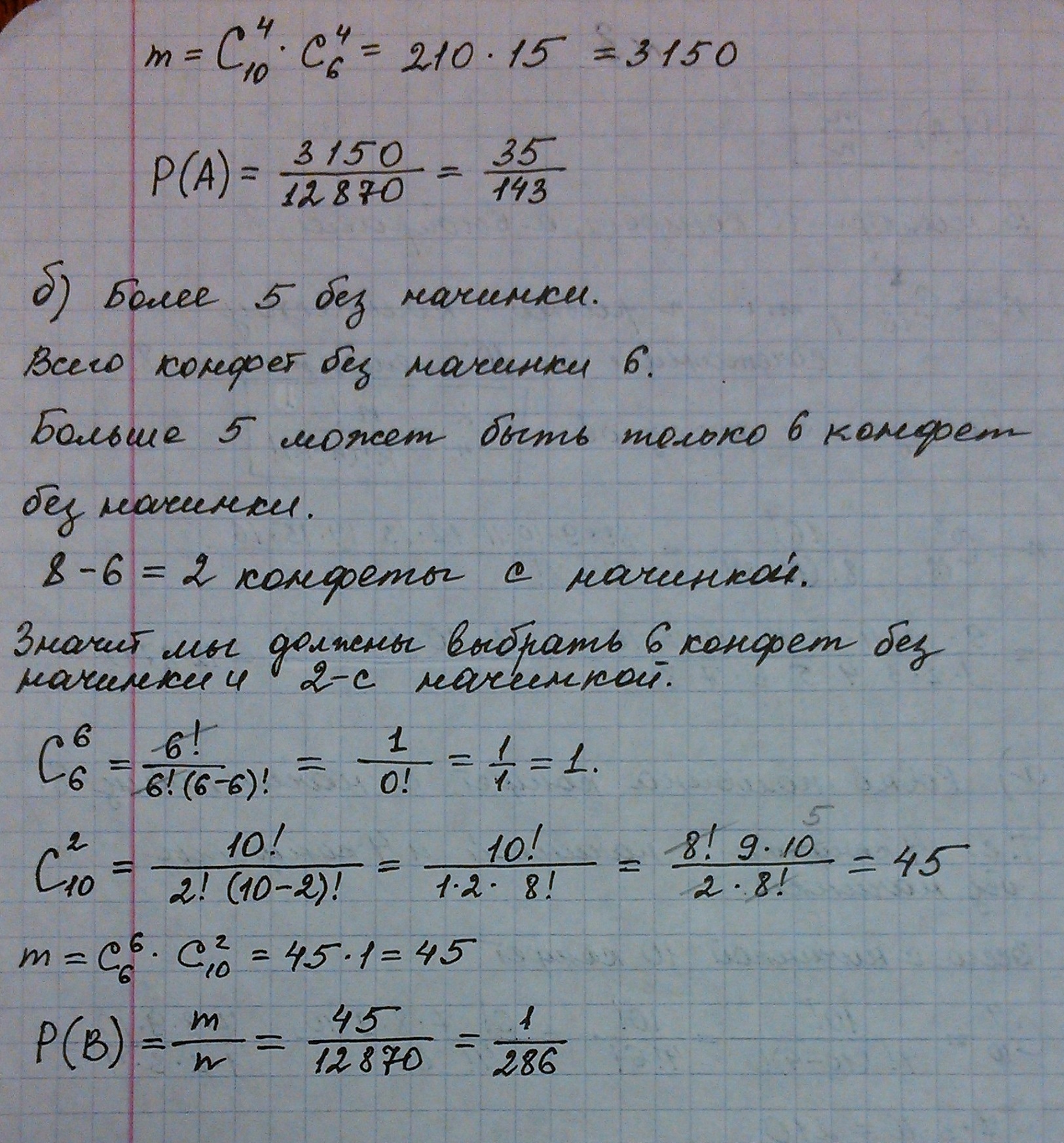 б) вероятность того, что более 5 конфет без начинки 1/286