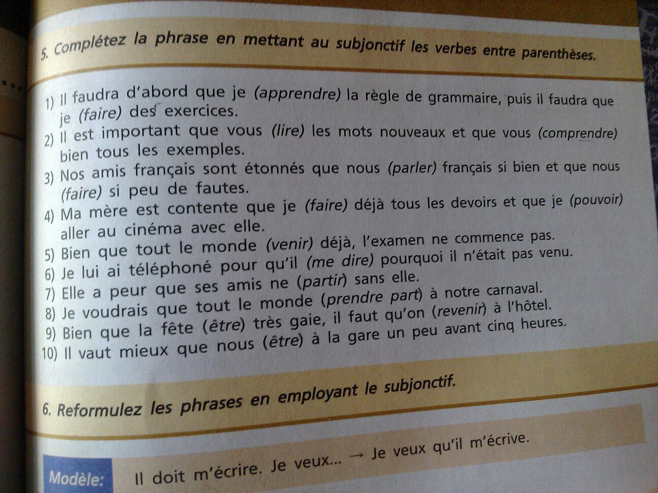 1) j'apprenne... je fasse, 2) lisiez .. compreniez, 3) nous parlions ...fassions, 4) je fasse... je puisse, 5) vienne, 6) il me dise, 7) partent, 8) prenne part, 9) soit... revienne, 10) soyons
