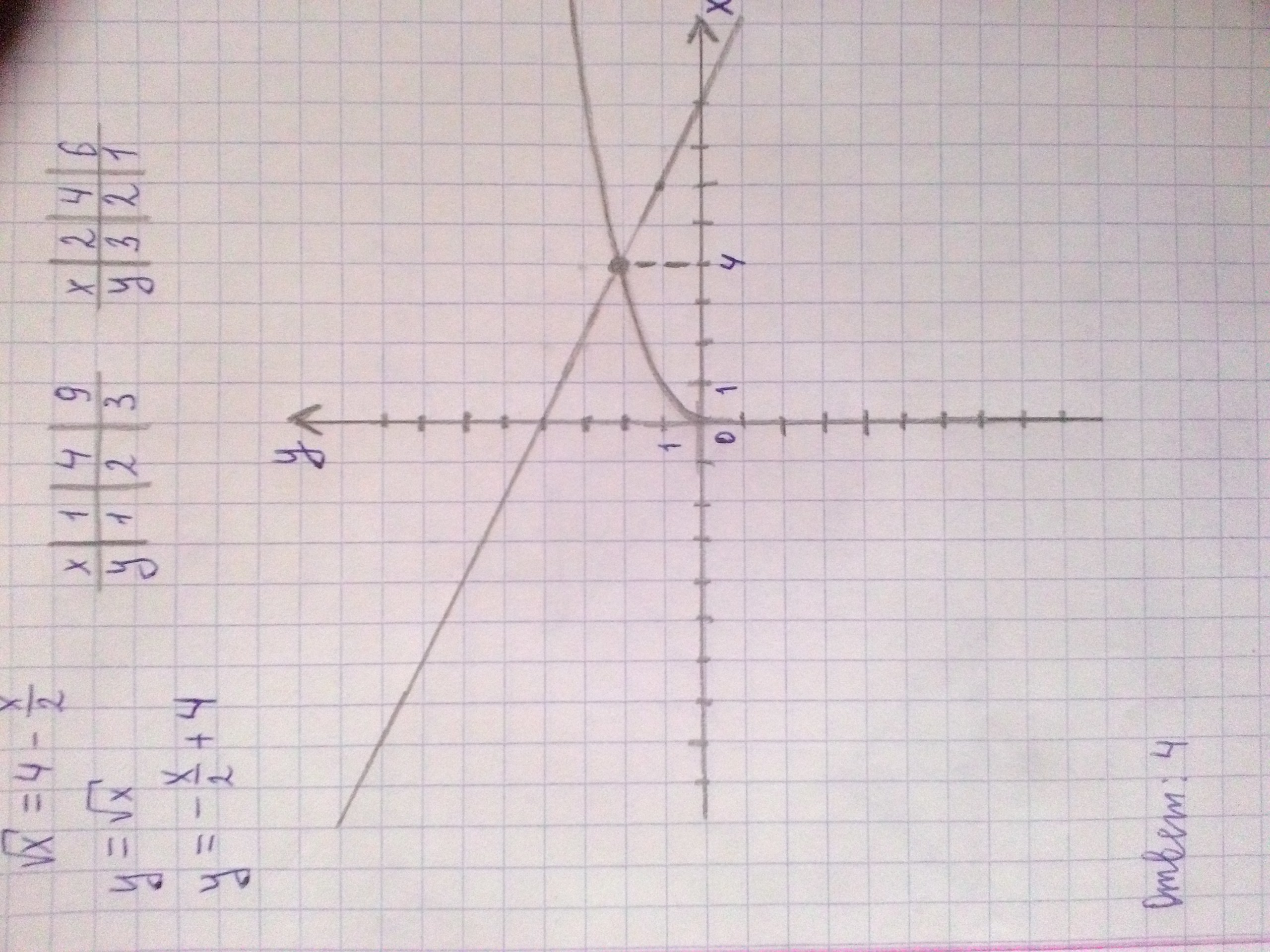 решите графически уравнение √x=4-x/2