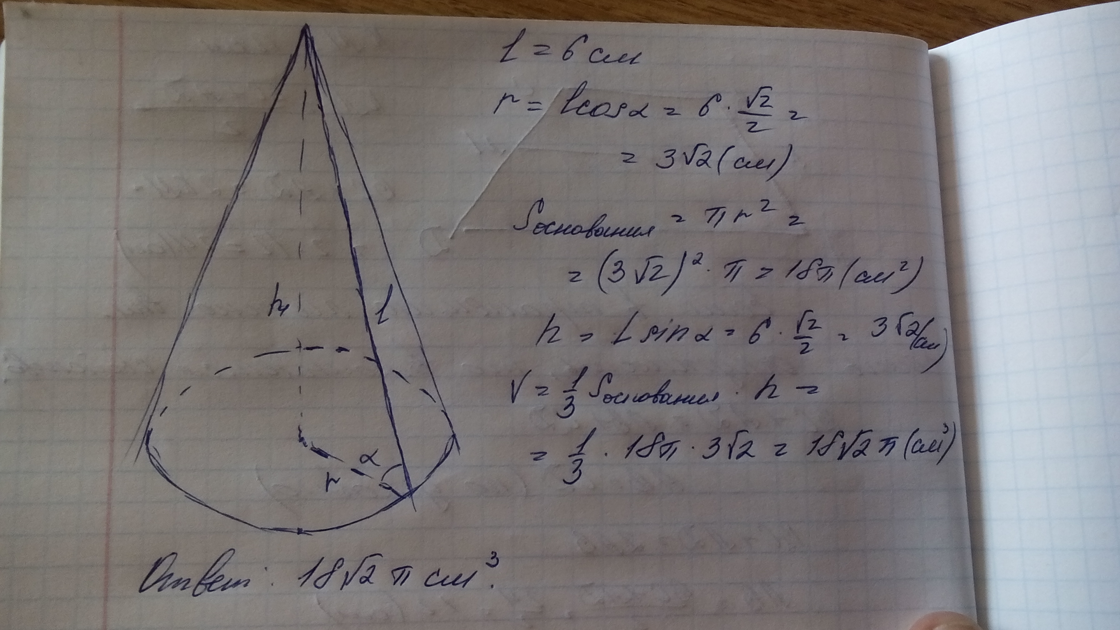 дан конус,образующая которая наклонена в плоскости основания под углом 45 градуса.Найдите объем конуса,если длина образующей ровна 6 см
