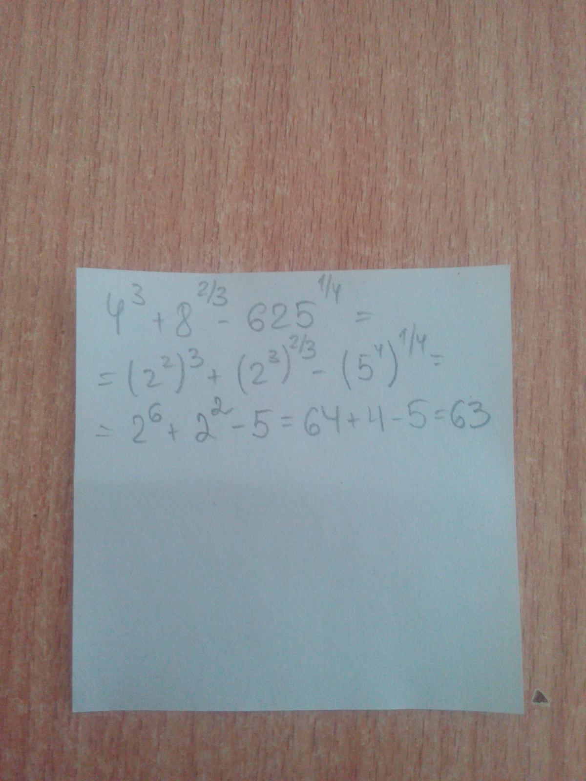 4 в 3 степени + 8 в 2/3 степени - 625 в 1/4 степени.Вычеслить значение выражения