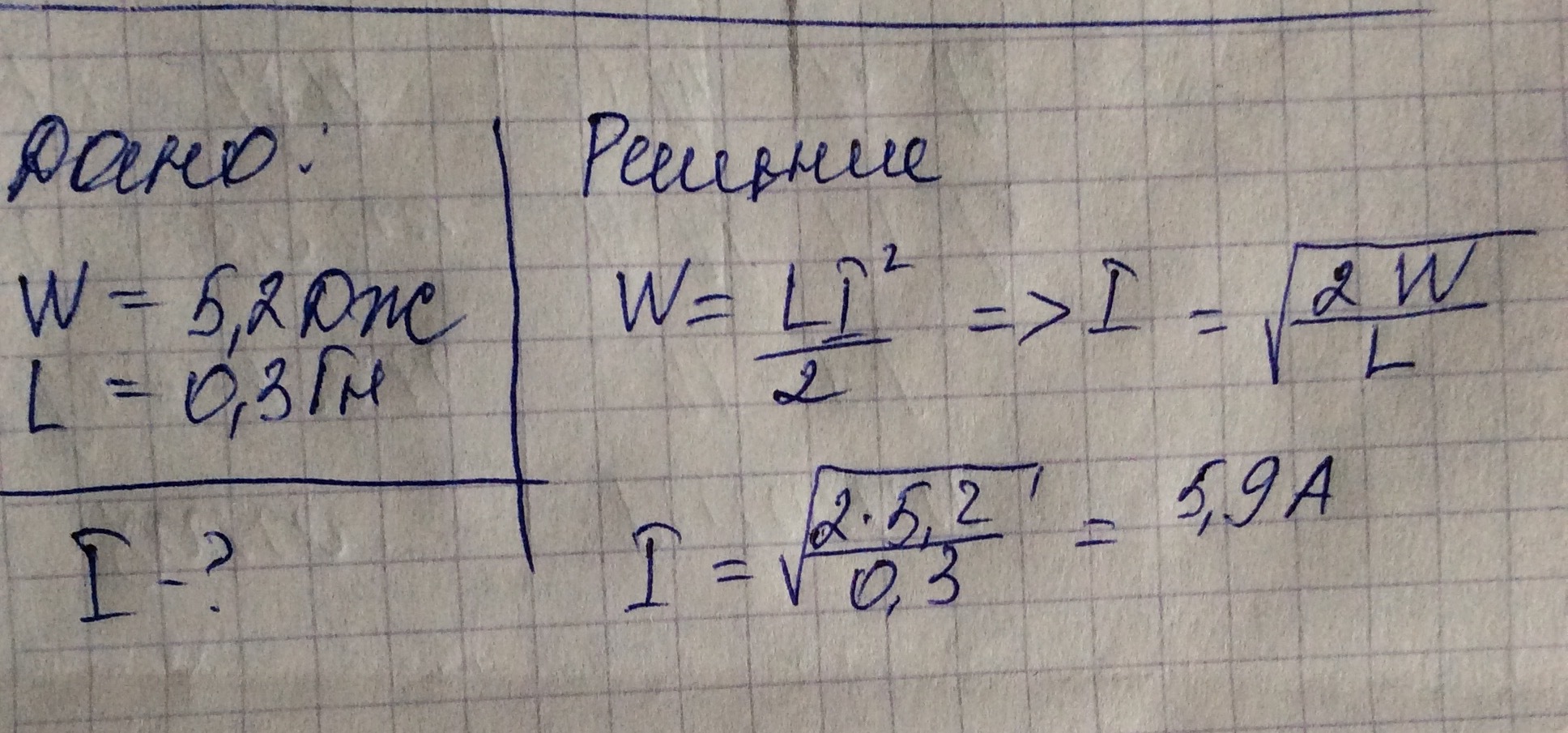 Энергия, запасенная в катушке, W = 5.2 Дж. Определить ток в катушке, если ее индуктивность L = 0.3 Гн