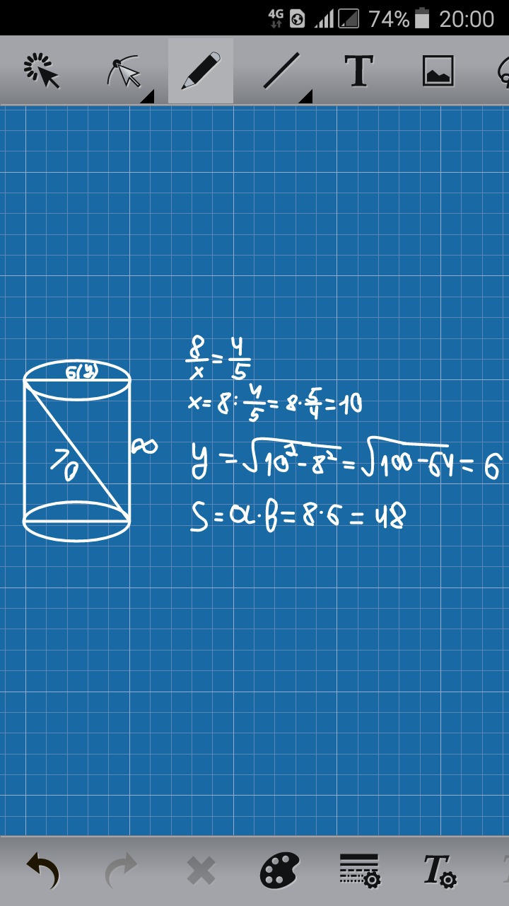 образующая цилиндра равна 8 см. Отношение длины образующей к диагонали осевого сечения цилиндра составляет 4/5. Найдите площадь осевого сечения.