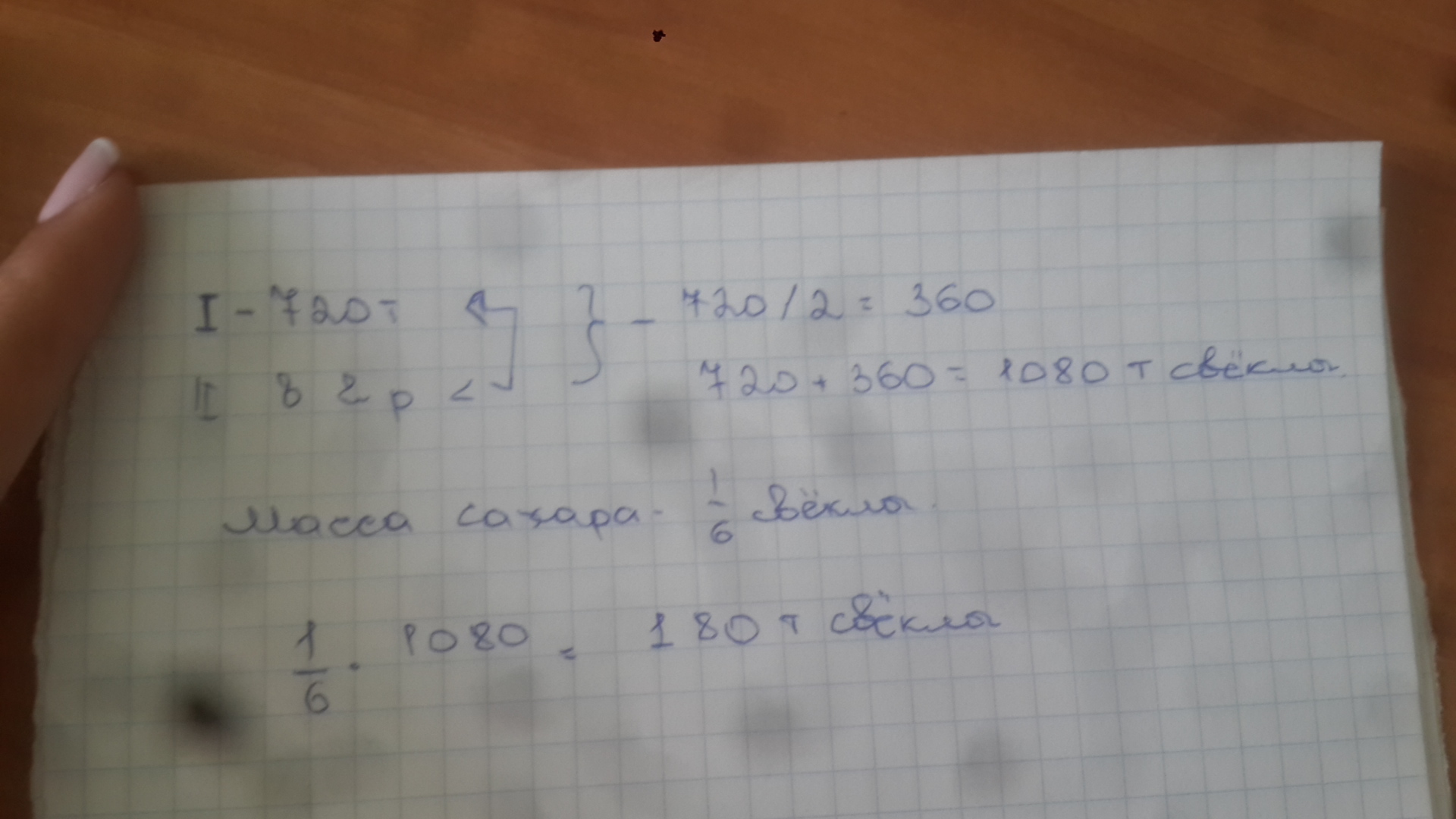 Решите пожалуйста задачу! На сахарный завод привезли в первый день 720 тонн свёклы, а во второй-в 2 раза меньше.Сколько сахара получилось из всей свёклы,если масса сахара составляла 1/6 массы свёклы?