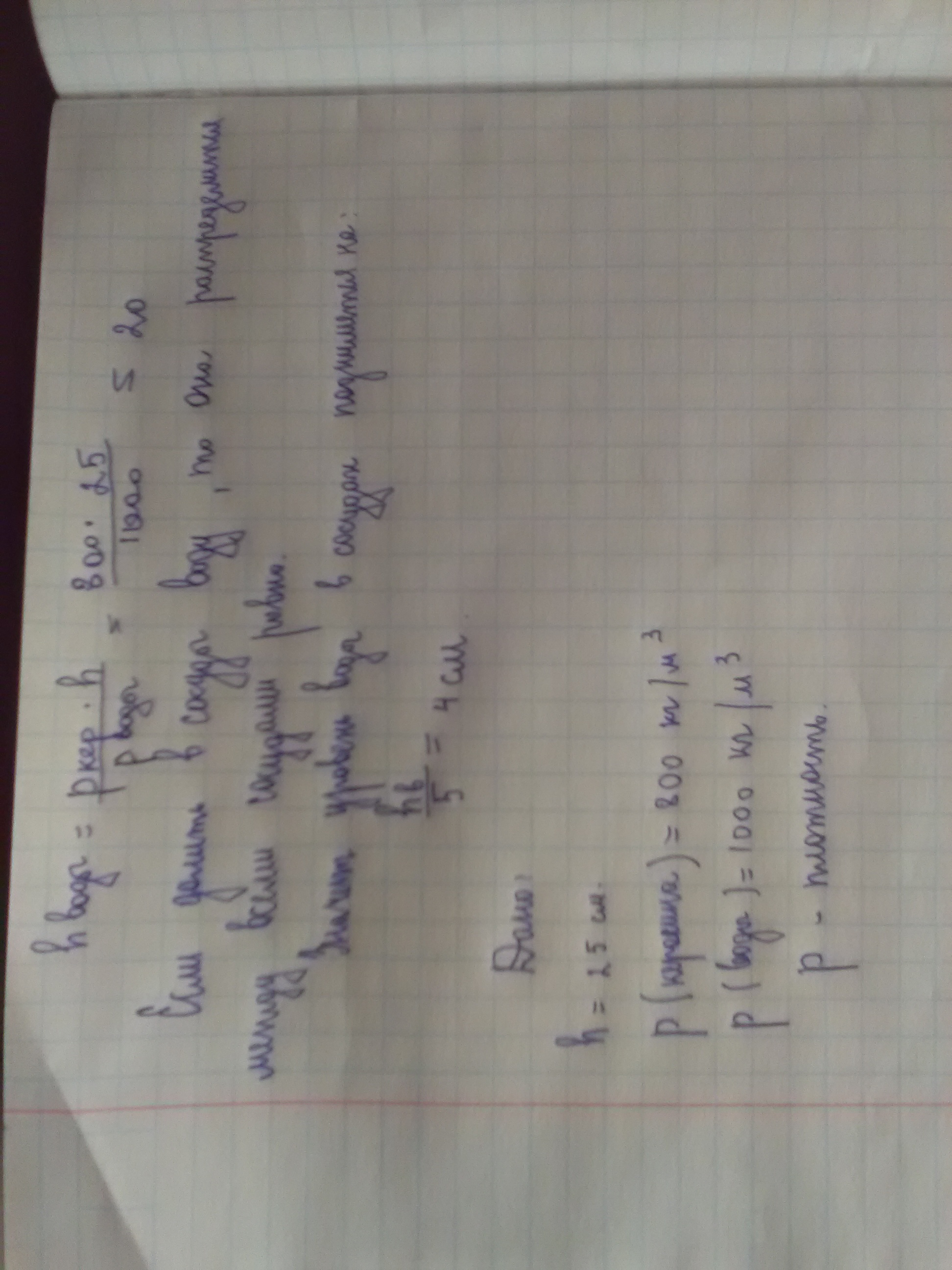 Таким образом в 1-м колене слой керосина 25 см а в остальных вода должна иметь уровень в 20 см, в противном случае будет перетекание жидкости. Столб воды в каждом колене должен создавать одинаковое давление.