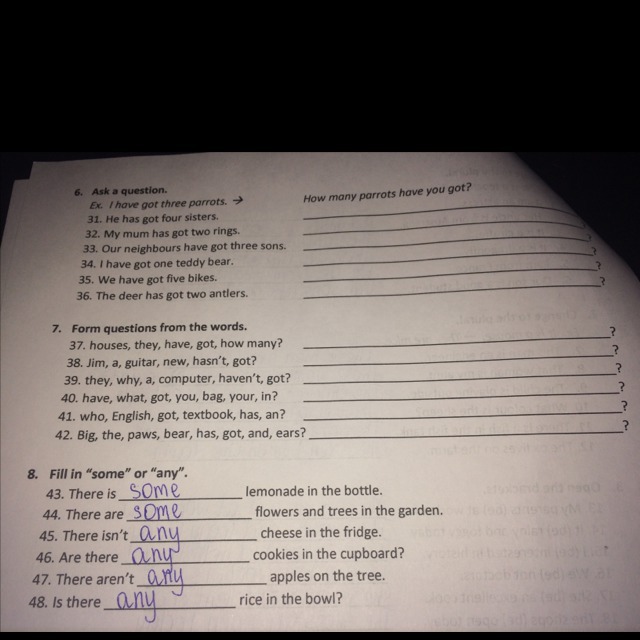 31How many sisters has he got? 32 How many rings has your mum got? 33 How many sons have our neigbour? 34How many teddy bear have you got? how many bikes we have? How mane antlers has deer got