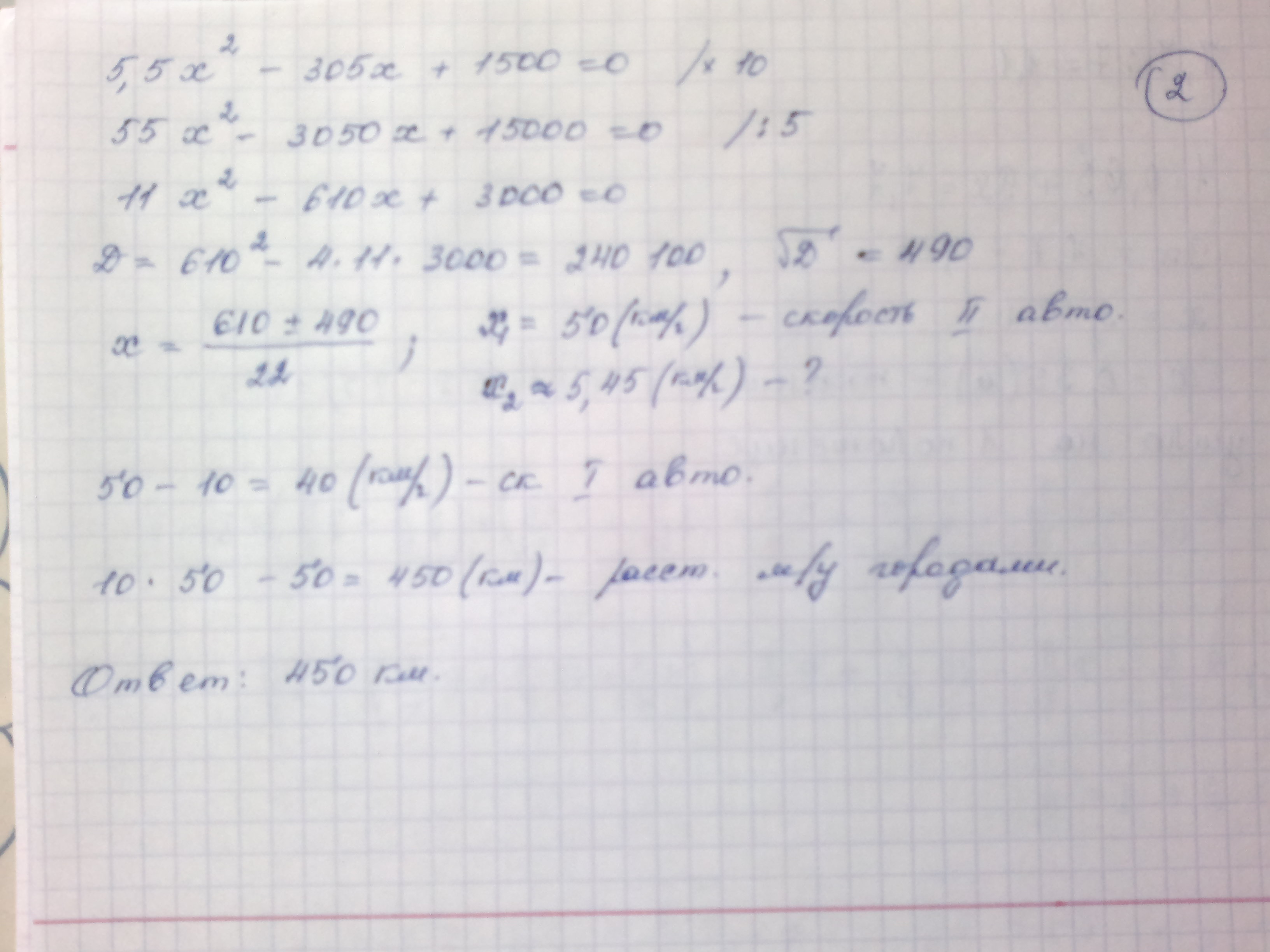 Спасибо, всё так. Правда, я составил другую систему уравнений: 1) 5v + 5(v+10) = s; 2) (s-150)/v - 150/(v+10) = 4.5, где v - скорост первого авто, s - расстояние между городами, но всё свелось к похожему квадратному уравнению и ответ тоже 450 км.