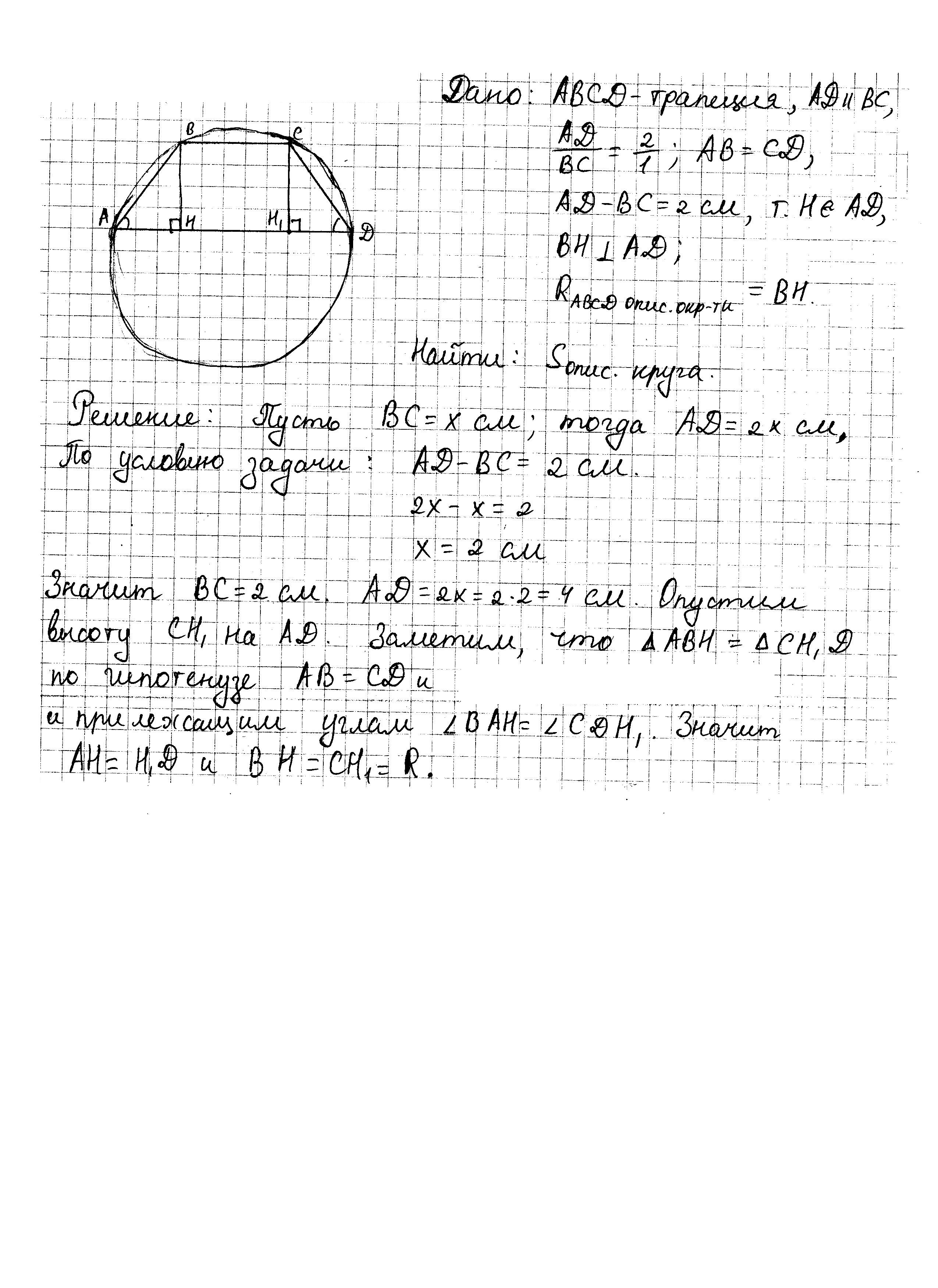 оснований равна 2 см, радиус описанной окружности равен высоте