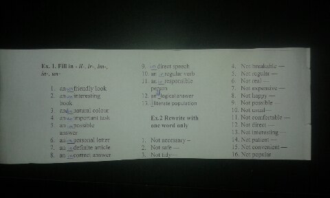 Во втором задании вам надо написать одним словом определенное выражение. Например, в русском не счастливый это грустный, получается not happy - sad, not interesting - boring и.т.д