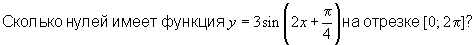 нули функции y = 3sin(2x+pi/4) ---это корни уравнения 3sin(2x+pi/4) = 0