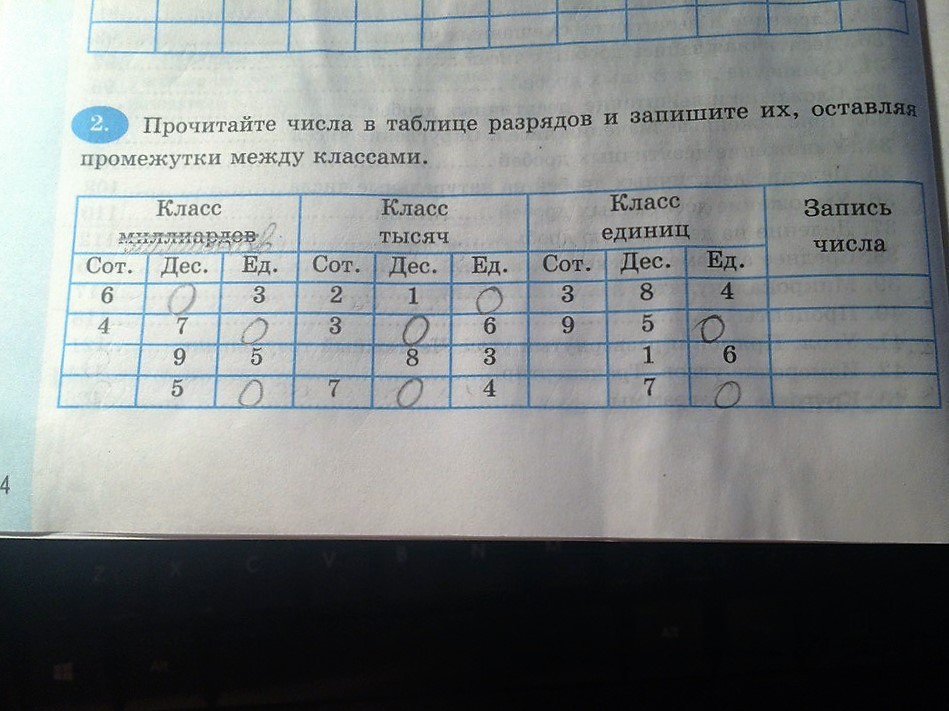 Прочитайте числа в таблице разрядов и запишите их оставляя промежутки между классами