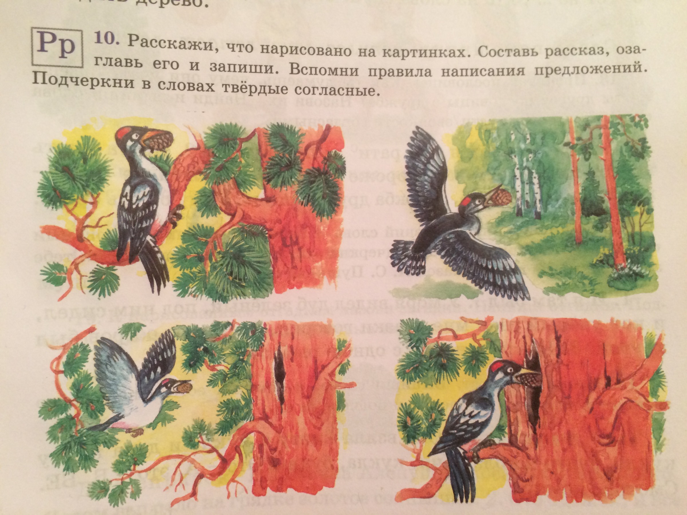 1. На ветаях широкой ели сидит красноглавый дятел. В клюве он держит бурую шишку. Его крылья уверенно свисают за спиной и переливаются серебристым цветом. Зеленые иголки ели распушились. 2. Что-то напугало дятла и он взлетел с ветки широкой ели, не выпуская из клюва шишку.3. Дятел отлетел от дерева и направился в сторону трёх берез.4. Он перелетел на другую, более старую сосну. И решил оставить свою "добычу" в дупле, что было в сосне.