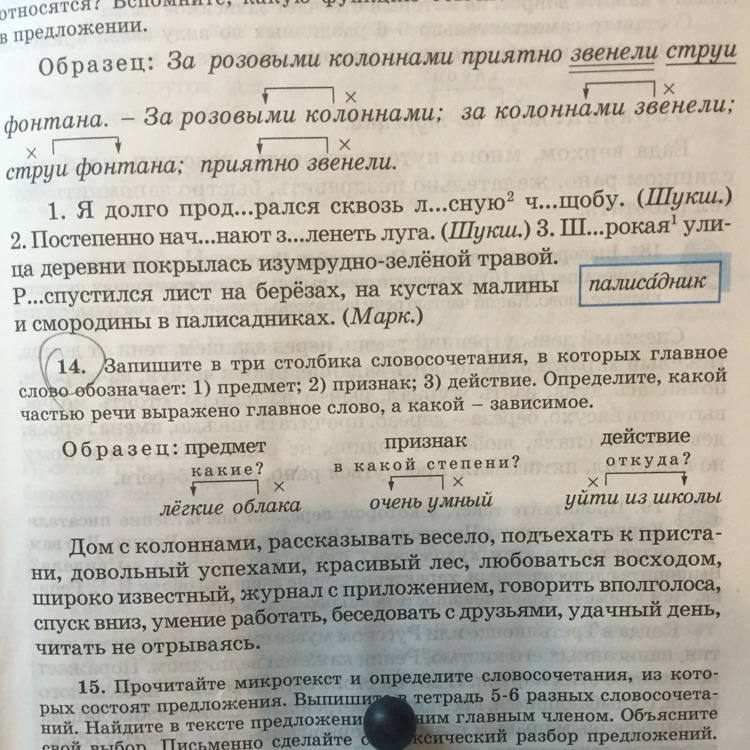 "Дом с колоннами" - это в первый столбик "Предмет". "Рассказывать весело" - это во второй столбик "Признак". "Подъехать к пристани" - а это в третий столбик "Действие". "Довольный успехами" - во второй столбик. "Красивый лес" - в первый. "Любоваться восходом" - во третий столбик. "Широко известный" - во второй столбик. "Журнал с приложением" - в первый столбик. "Говорить вполголоса" - в третий столбик. "Спуск вниз" - во второй столбик. "Умение работать" - Во второй столбик. "Беседовать с друзьями" - в третий столбик. "Удачный день" - в первый столбик. "Читать не отрываясь" - в третий столбик.