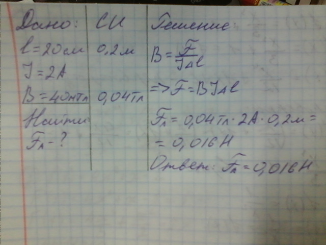 чему равна сила ампера действующая на проводник 20 см силой тока 2 ам магнитная индукция 40 мтл